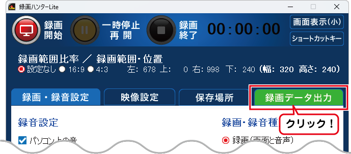 「録画データ出力」タブをクリックします。