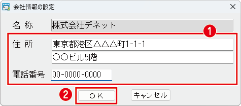 ❶住所、電話番号を入力して、❷「OK」ボタンをクリックします。
