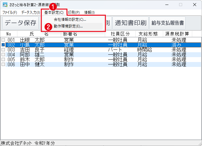 ❶メイン画面が表示されましたら、社員一覧から源泉徴収票を作成する社員を選択します。