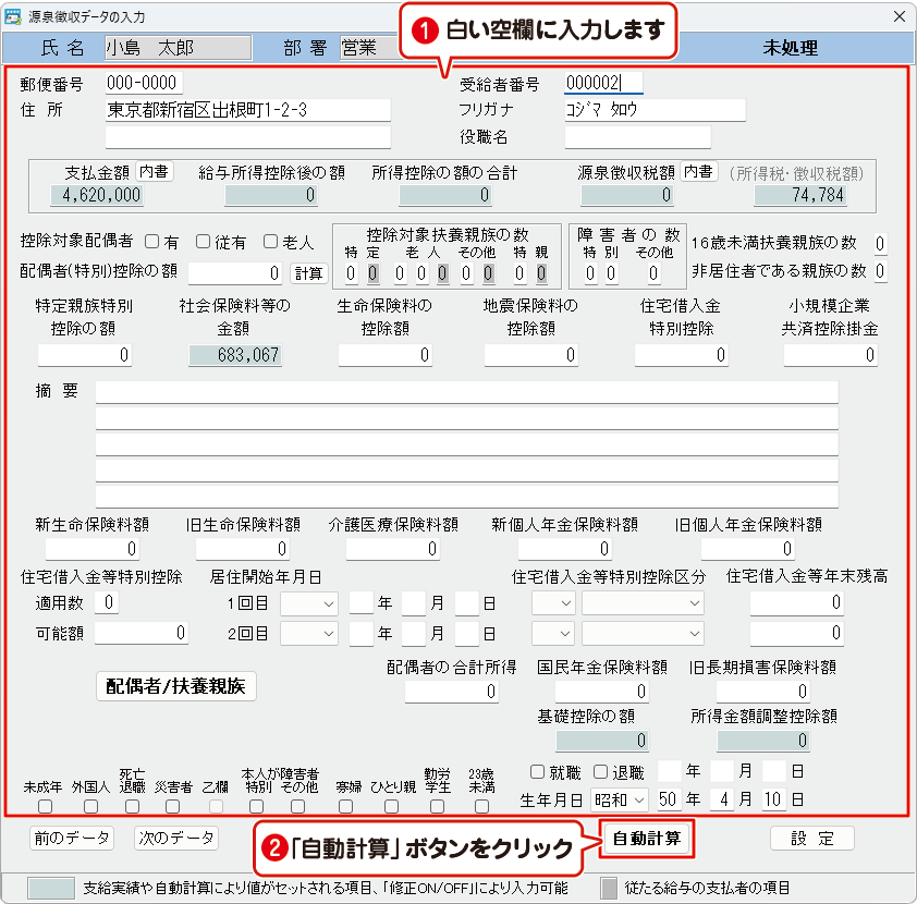 ❷入力が終わりましたら、自動計算ボタンをクリックして、源泉徴収税額を自動計算します。