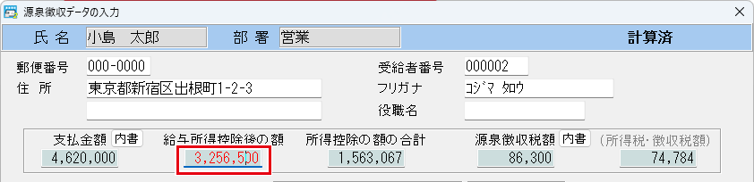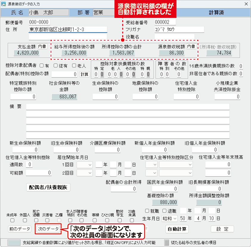 給与所得控除後の額、所得控除の額の合計、源泉徴収税額の欄が自動計算されます。