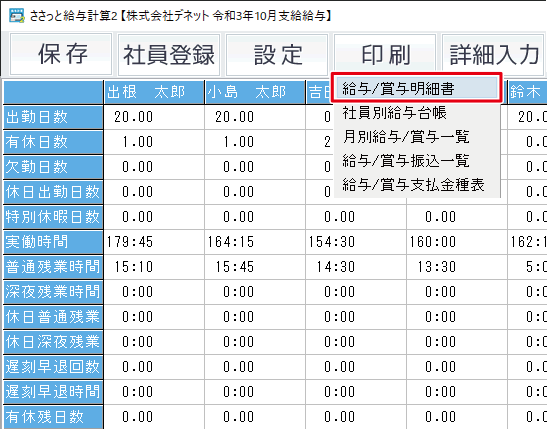 「印刷」ボタンをクリックして、表示されるメニューから「給与/賞与明細書」を選択します。