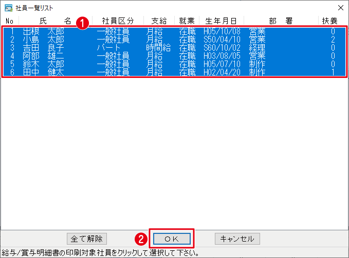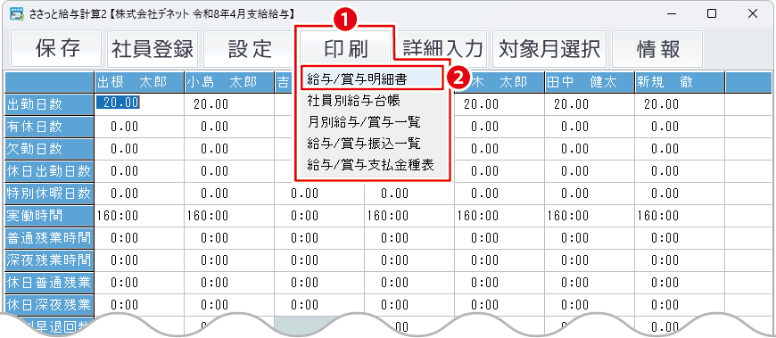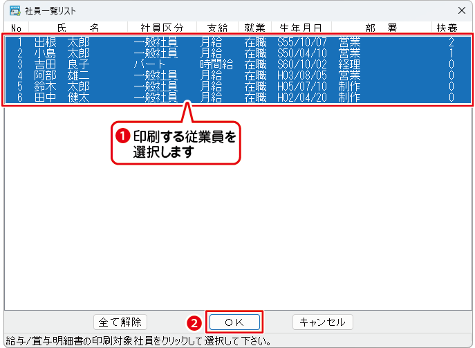 ❶給与明細を印刷する従業員をクリックして選択します。