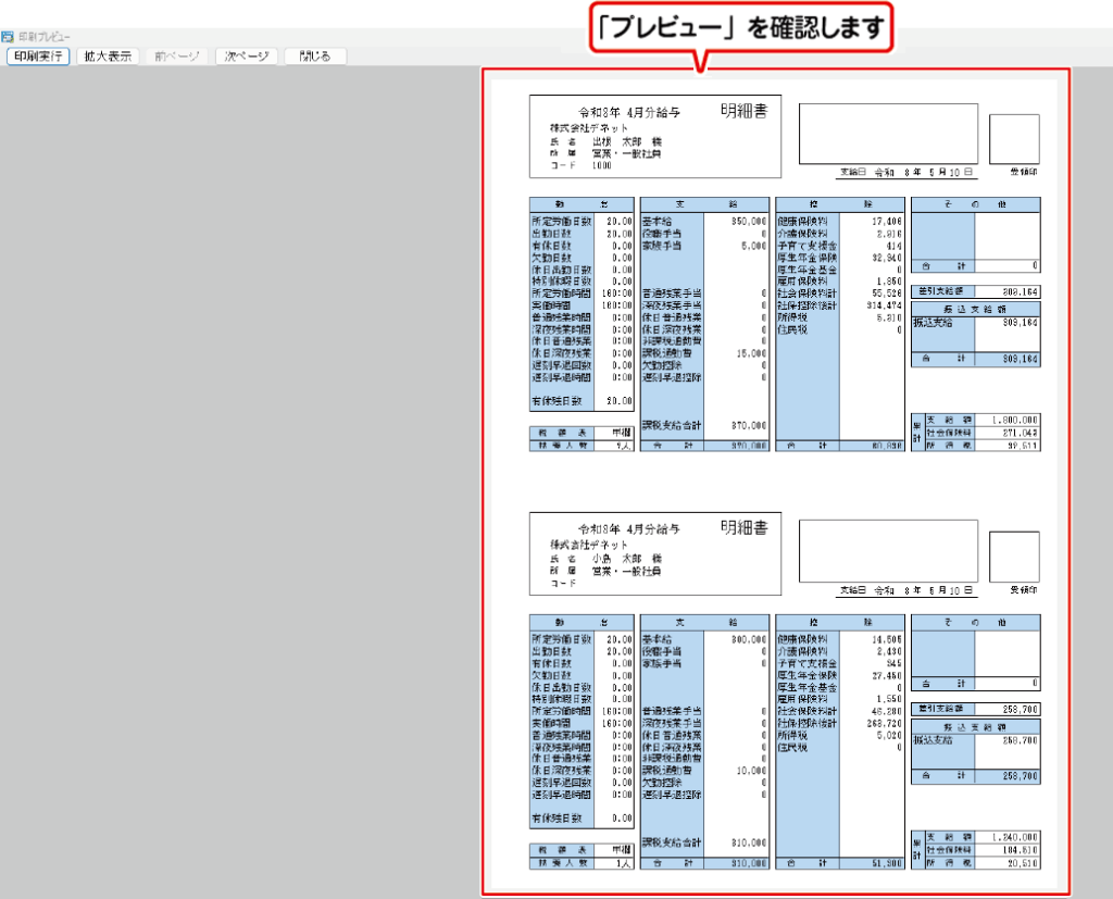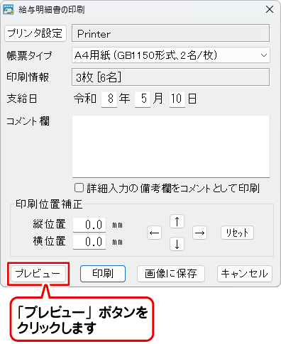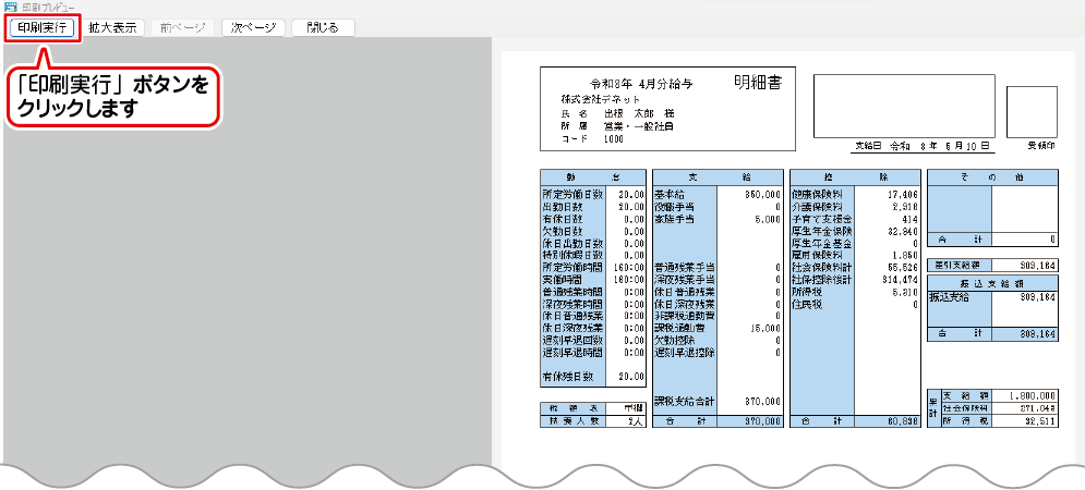 給与明細書の印刷画面が表示されましたら、