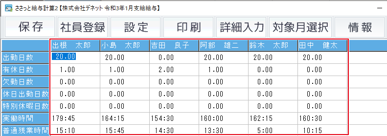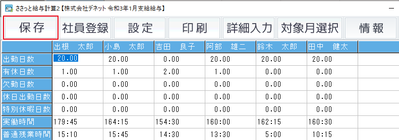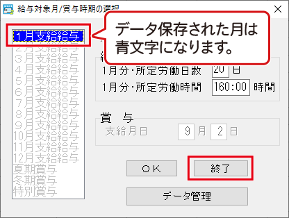 「給与対象月/賞与時期の選択」画面に戻ります。※データ保存された月は青文字になります。