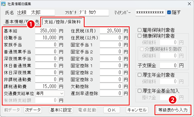 ❶基本給、手当、通勤費等の金額を入力します。