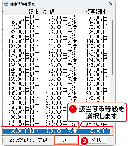 ❸「等級表から入力」ボタンをクリックして、「健康保険等級表の報酬月額」を