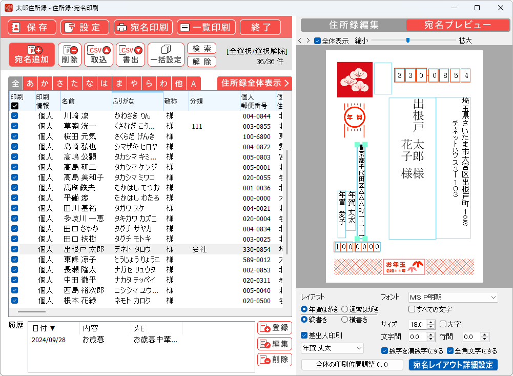 右側の表示を「宛名プレビュー」に切り替えると、操作がしやすいです。