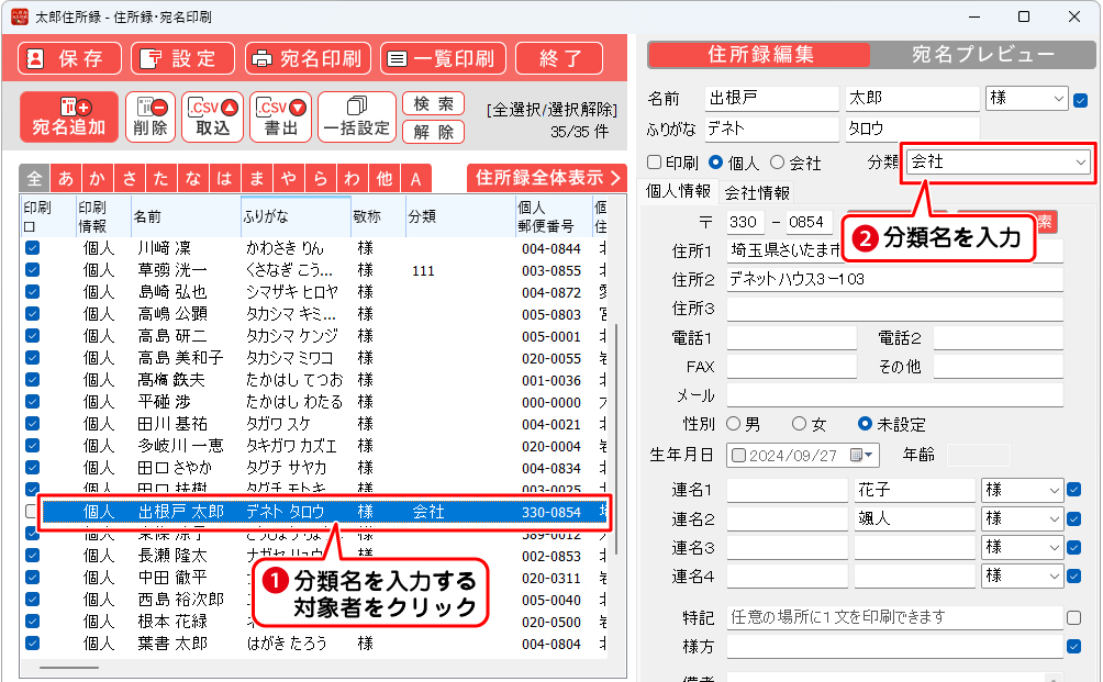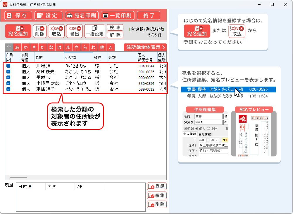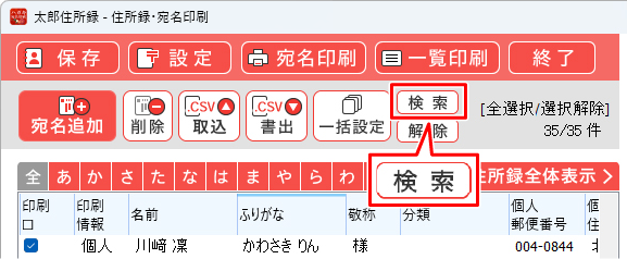 パソコンでハガキ作成+宛名印刷 ソフト使い放題版予め、同じ分類名を登録し分類(グループ)登録しておくと、検索機能で絞り込み、
