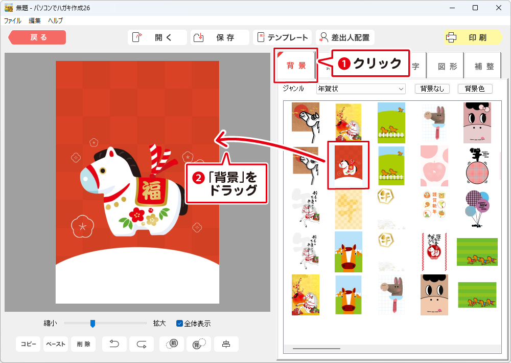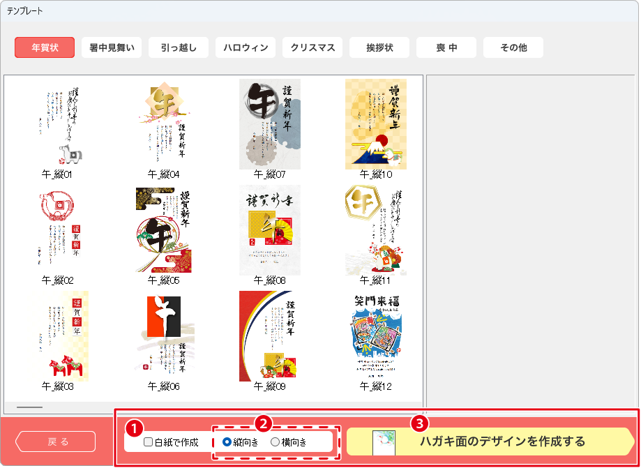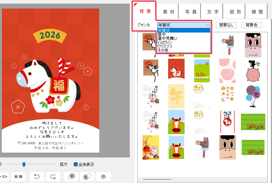 背景のジャンルは、年賀状/喪中/暑中見舞い/ハロウィン/クリスマス/その他