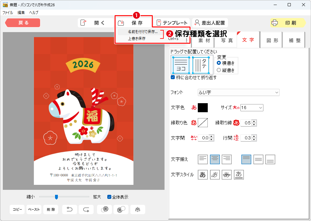 ❷「名前を付けて保存」、「上書き保存」保存種類を選択し適宜保存行います。