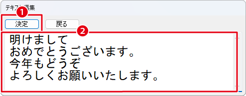 ❶ テキスト編集画面より、文字を入力し、❷「決定」をクリックします。