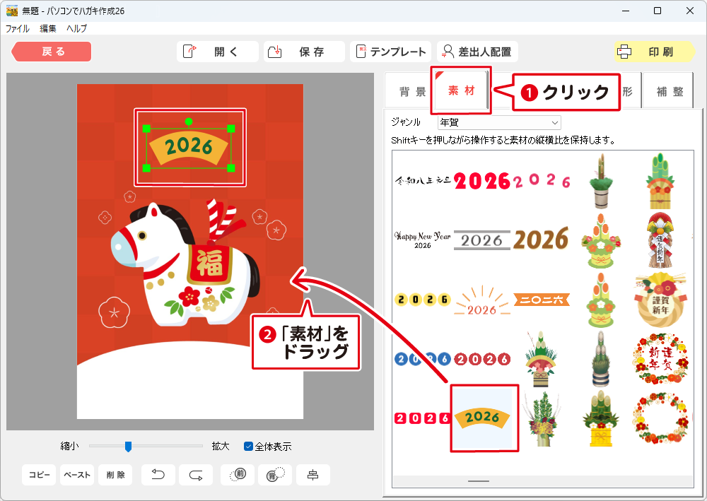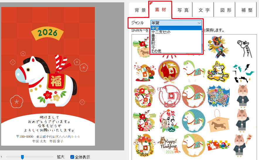 素材のジャンルは、年賀/十二支セット/春/夏/秋/冬/その他 から選択ができます。