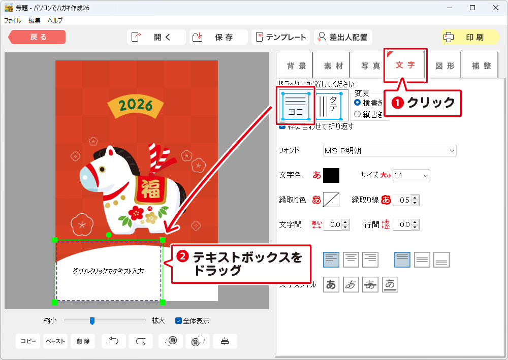 「文字」タブをクリックし、ヨコ(横書き)かタテ(縦書き)を選択し、