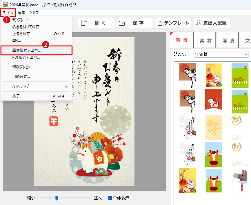 1. ❶ファイルメニューから ❷「画像形式で保存」を選択します。
