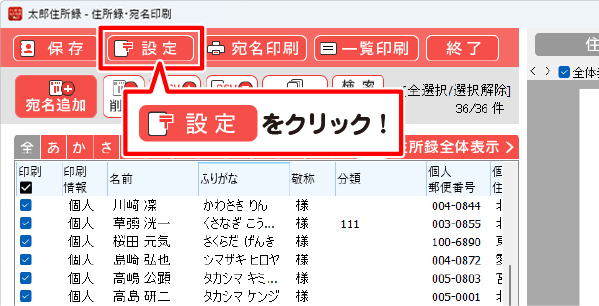 「住所録・宛名印刷」から住所録を表示し、宛名面に差出人の郵便番号を枠に表示します。