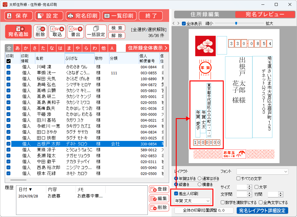 登録した差出人情報は、「住所詳細切替」から 「差出人印刷」にチェックを入れて