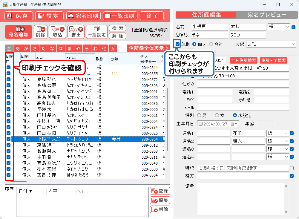 1.宛名リストを表示、印刷チェックの確認 パソコンでハガキ作成+宛名印刷26 2025.09.272025.09.29 保存した住所録を開き、印刷チェックを確認します。宛名左側 チェックが入っていると印刷対象になります。 印刷対象から外す場合 一括設定で印刷チェックのあり、なし設定はこちら 2.宛名プレビューへ ページの先頭へ