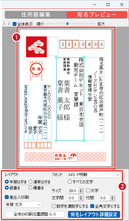 宛名レイアウト詳細設定を適宜行います。