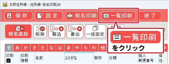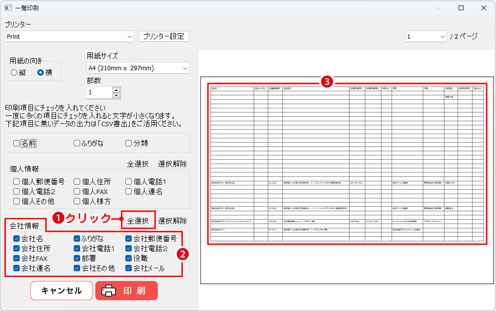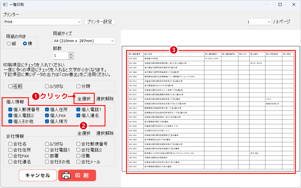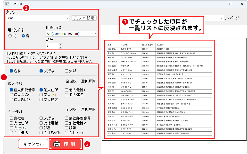 必要な印刷項目にチェックし、住所録一覧リストの印刷ができます。
