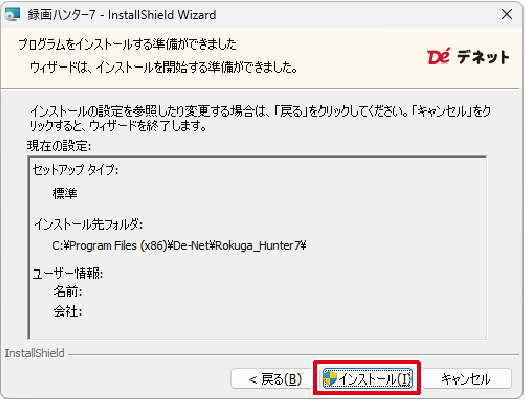 インストール先等の情報が表示されます。確認を行い、インストールを行う場合は