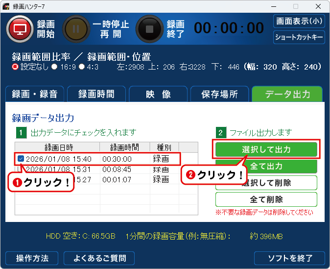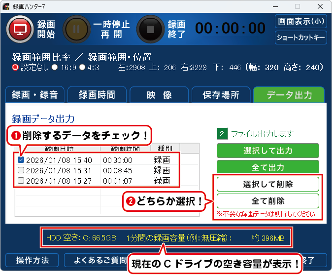 既に動画または音声ファイルとして出力した録画データは、選択して削除してください。