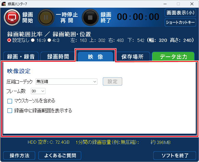 ※圧縮コーデックを選択した場合、 無圧縮と比較すると画質が粗くなる場合があります。