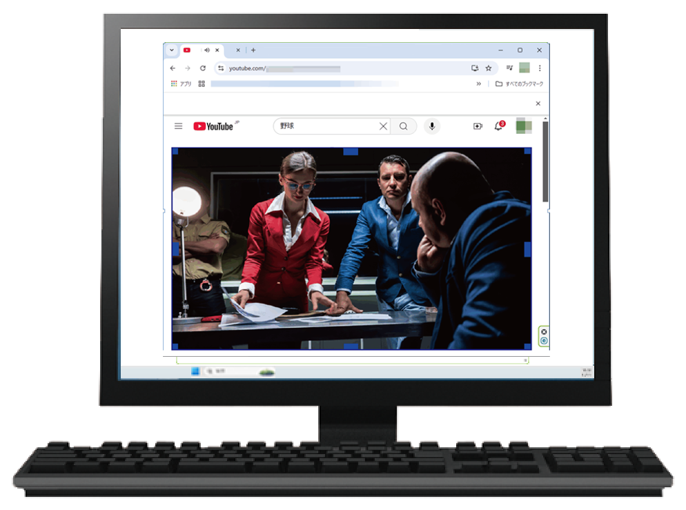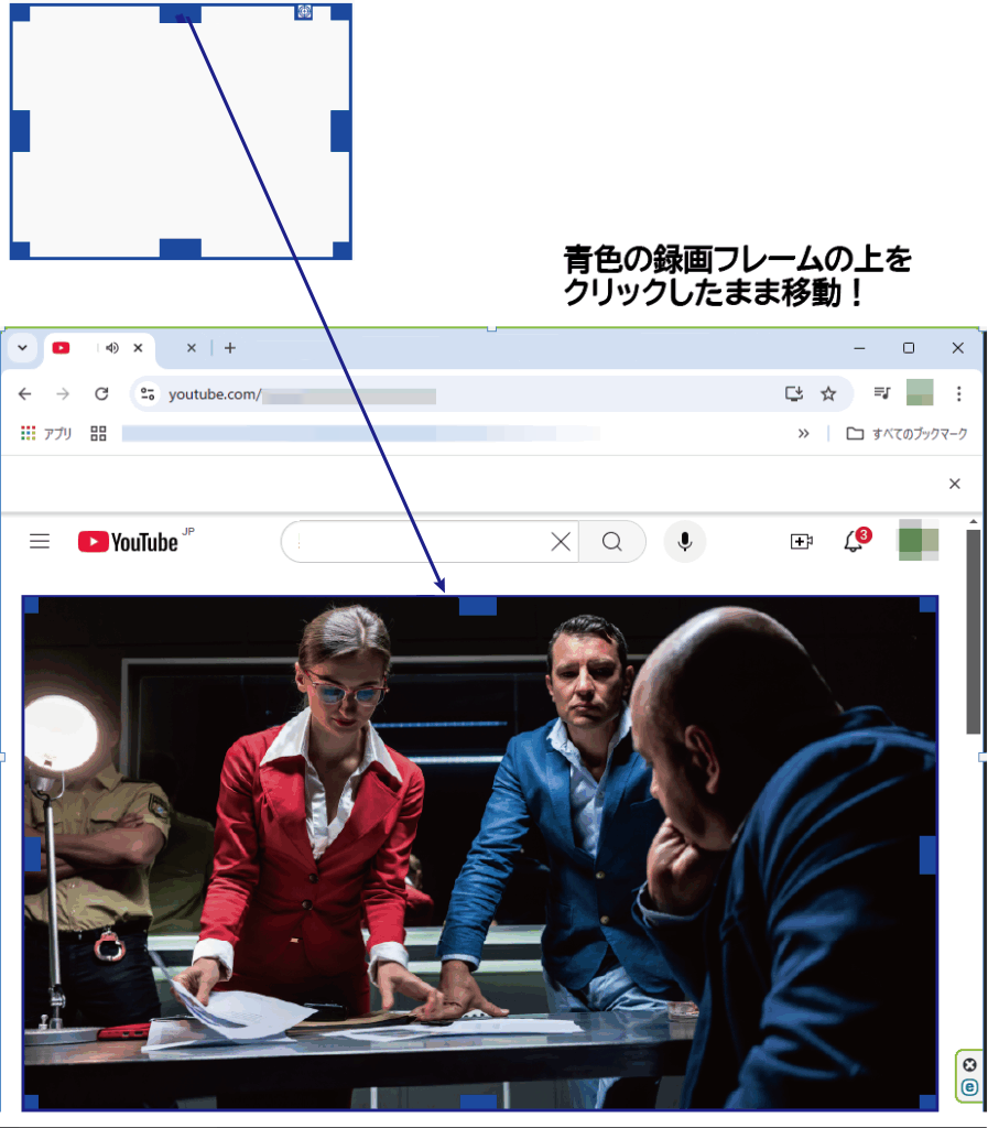 予め、録画したい映像をパソコン上に用意し、録画フレームの位置やサイズを調整し、