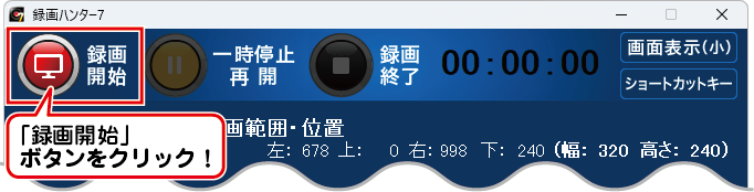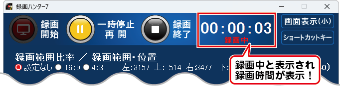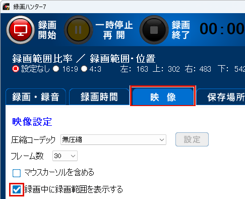 録画フレームの位置やサイズを調整し録画範囲を設定後、録画開始します。