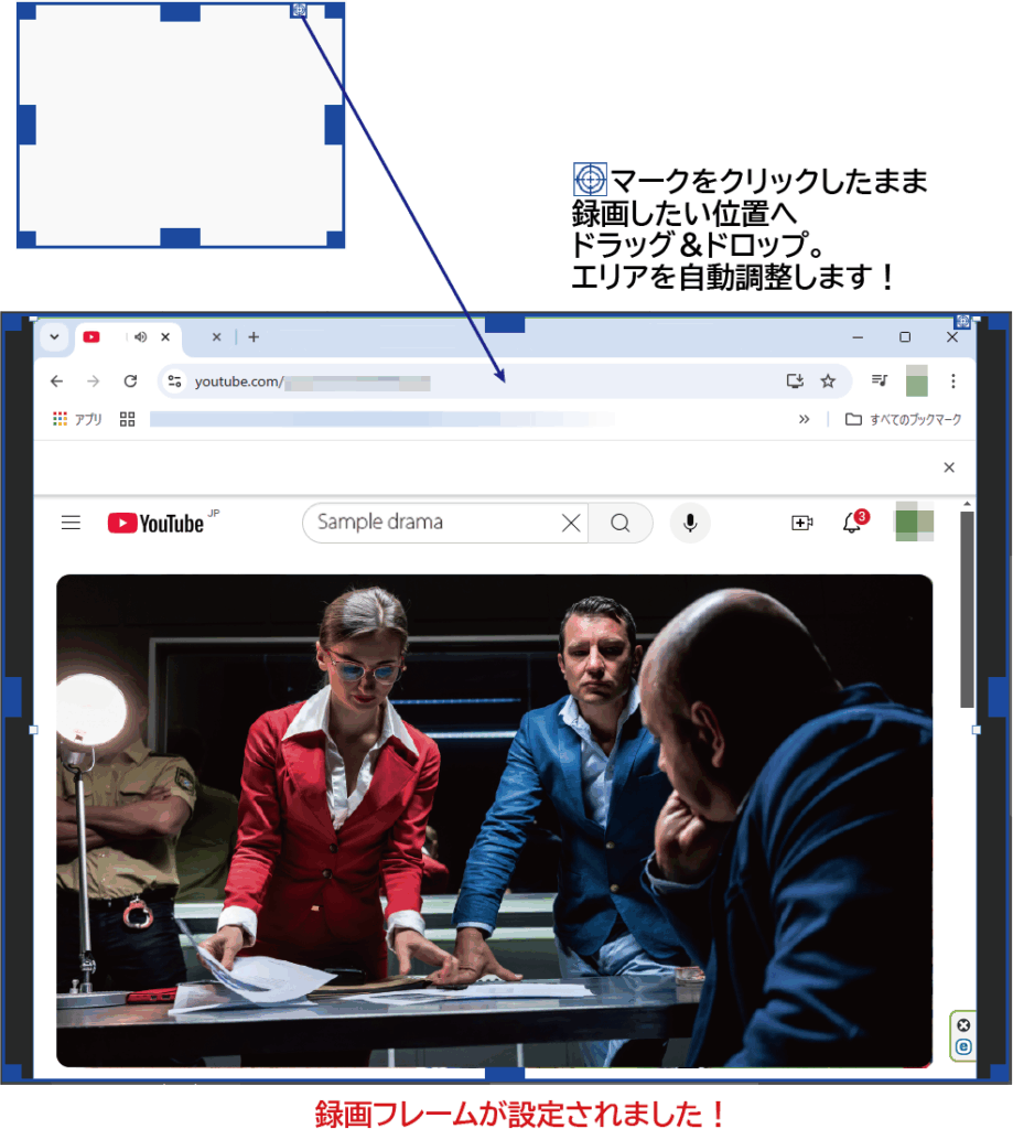 マウス操作で録画フレームの位置とサイズを設定します。