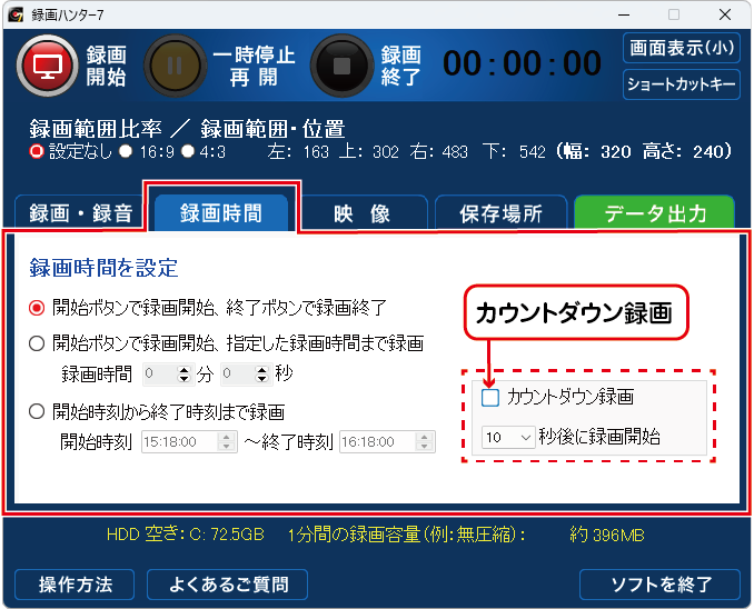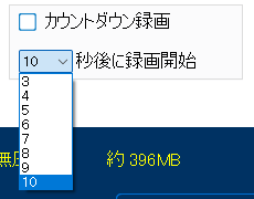 | □ カウントダウン録画 □をクリックしてチェックを入れると、 「録画開始」ボタンをクリックしてから指定された秒数後に録画が開始されます。 3~10秒で設定ができます。 ![]() (「開始時刻から終了時刻で終了」を選択した場合は使用できません。) |