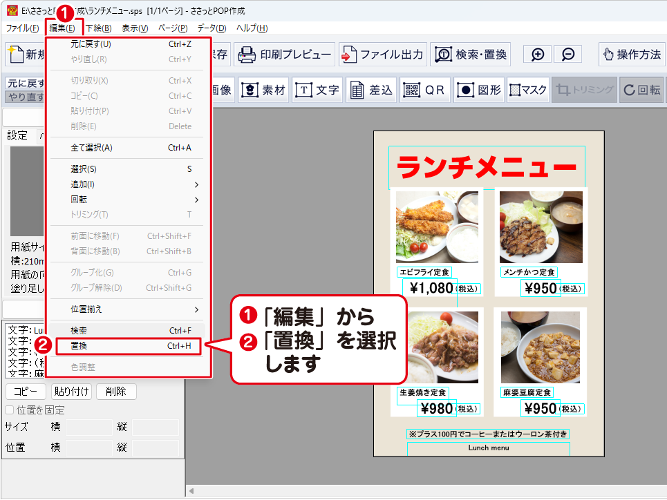 「編集」メニューから「置換」を選択