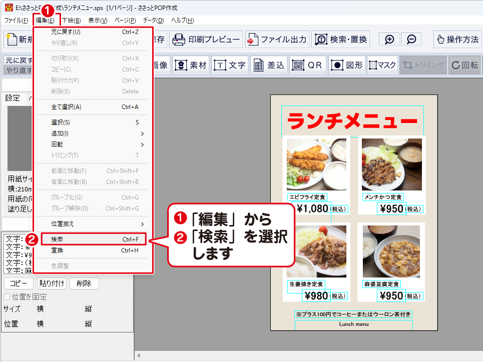 「編集」メニューから「検索」を選択