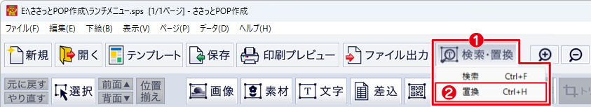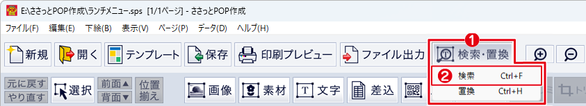 「検索・置換」を使って、文字シート内の文字の検索・置換をおこないます。
