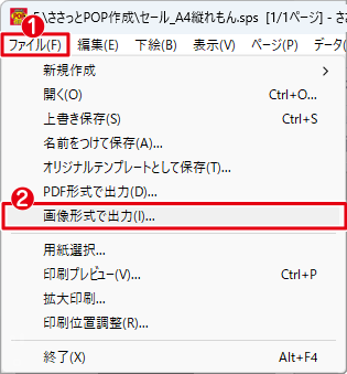 ❶「ファイル」メニューから、❷「画像形式で出力」を選択します。