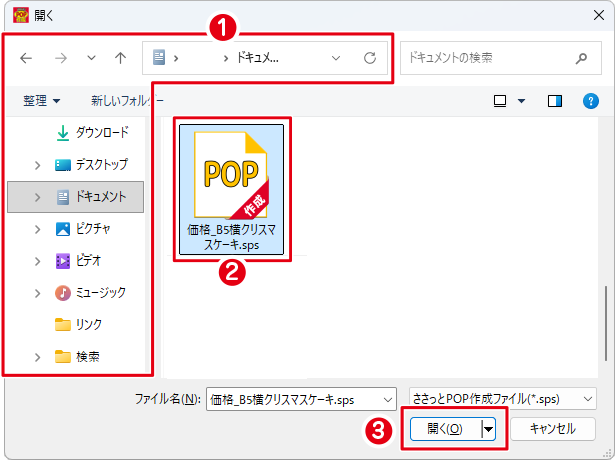 ❸「開く」ボタンを選択します。