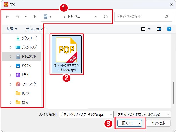 ❸「開く」ボタンを選択します。