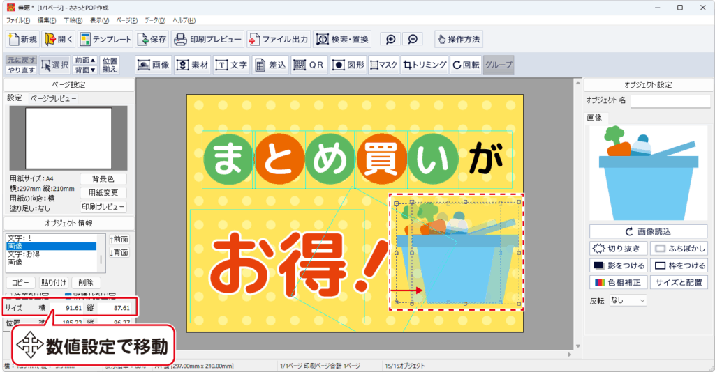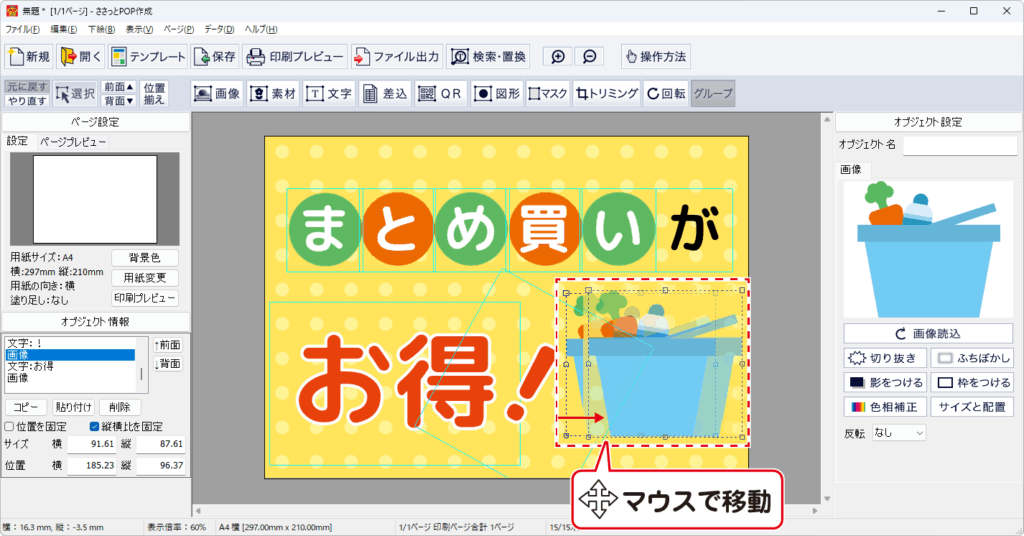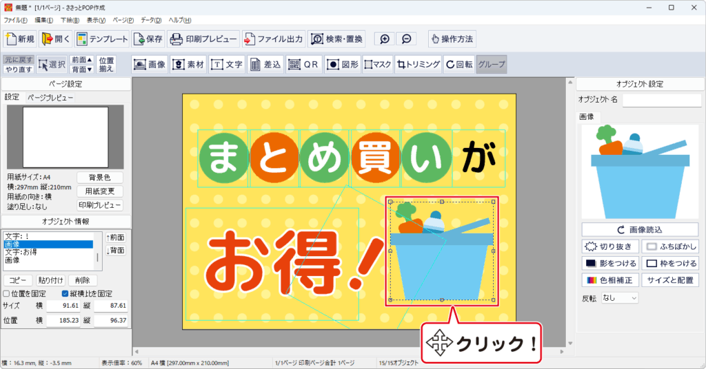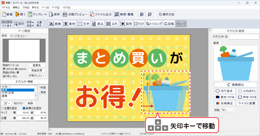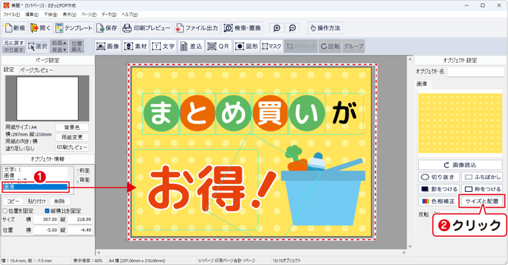 複数オブジェクトを選択する場合 例:「画像」と「文字」