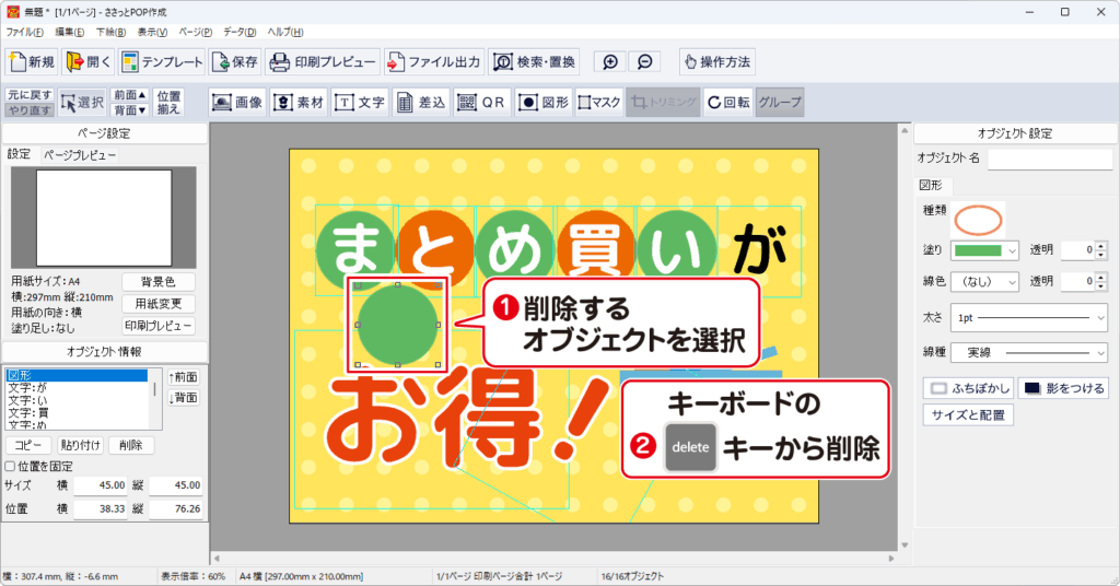 キーボードの「Delete」キーから、オブジェクトを削除することもできます。