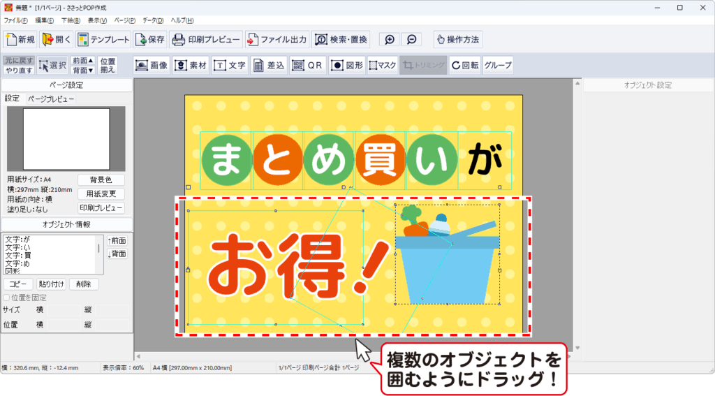 複数のオブジェクトを囲むようにドラッグして選択します。