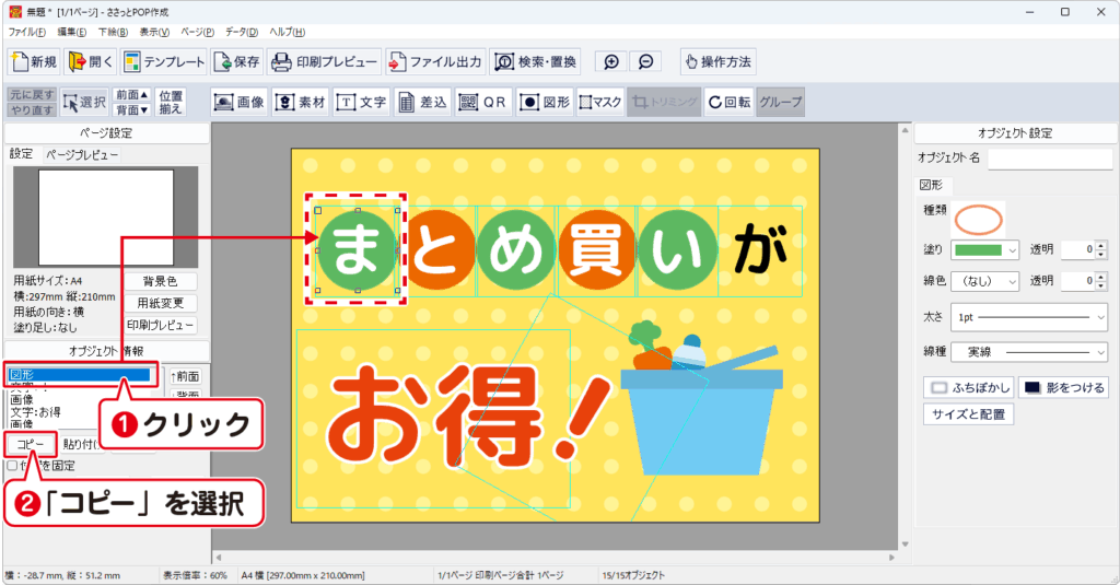 画面左側の「オブジェクト情報」から「コピー」を選択します