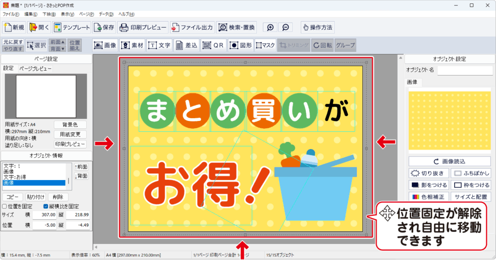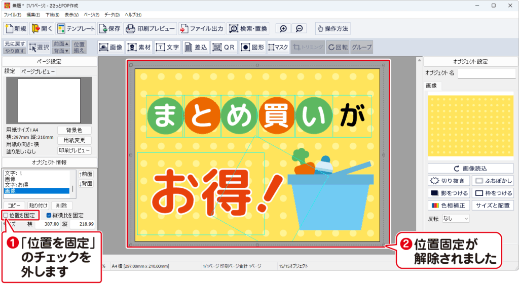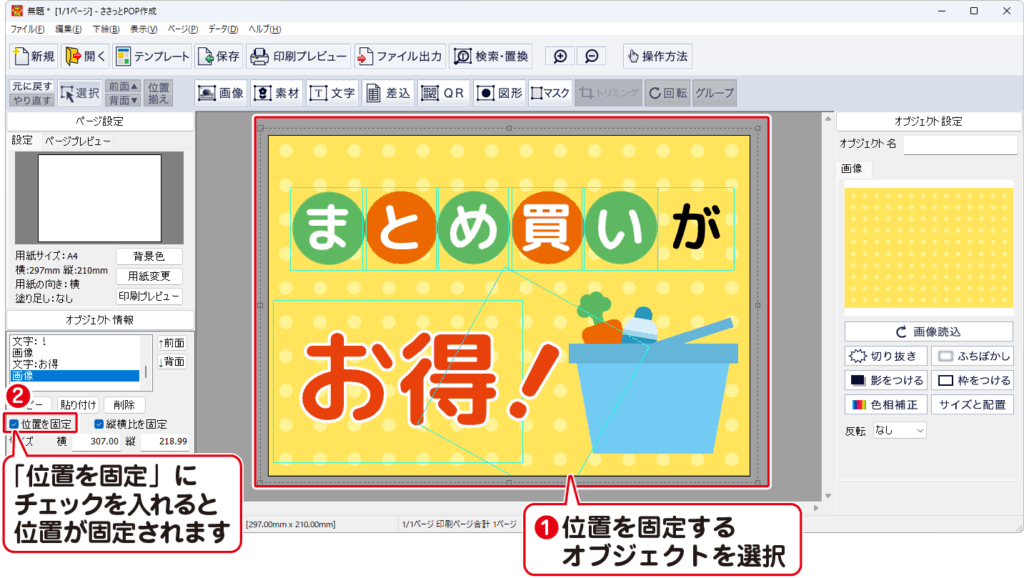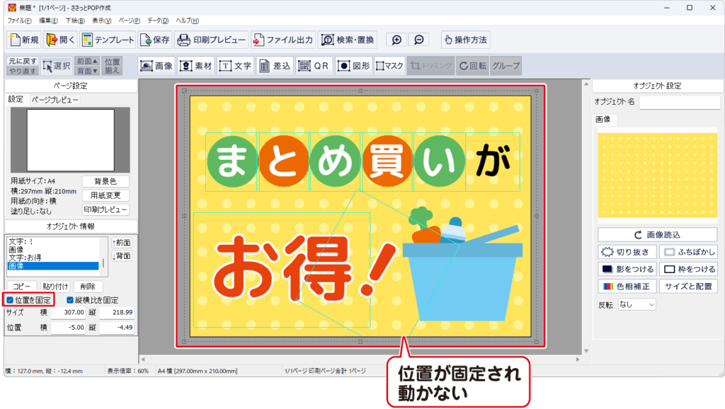 画面右下の「位置を固定」にチェックを入れると、選択したオブジェクトは位置が固定されて