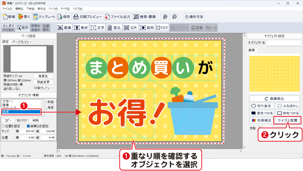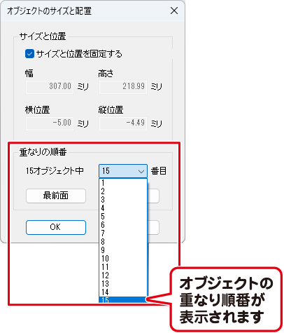 「サイズと配置」からオブジェクトの重なり順が確認できます。