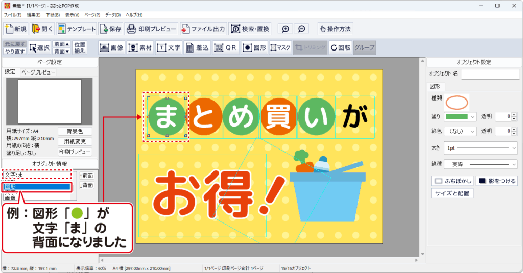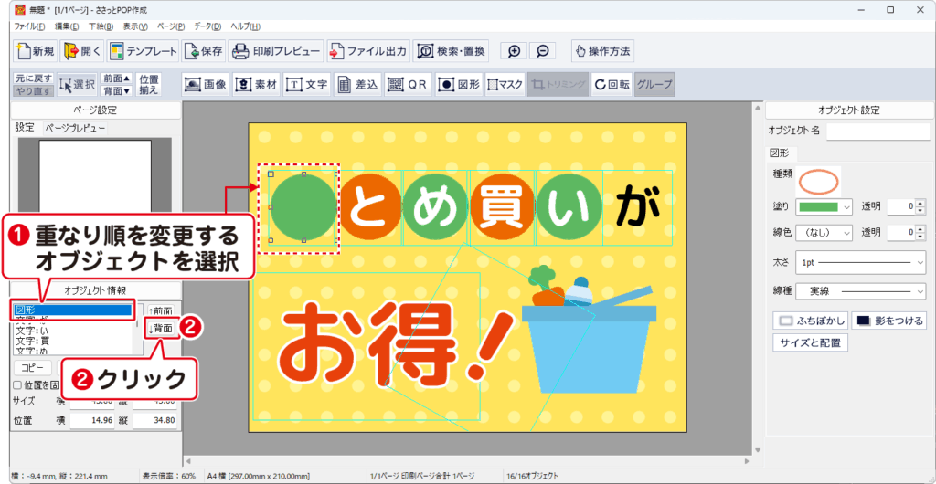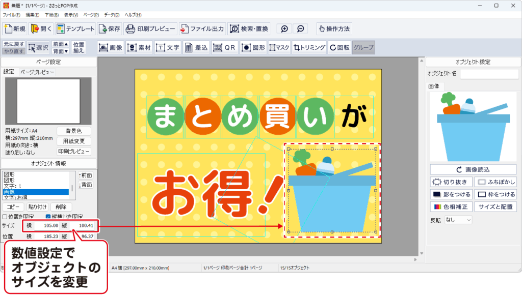 数値設定でオブジェクトのサイズを変更します。例:図形を拡大