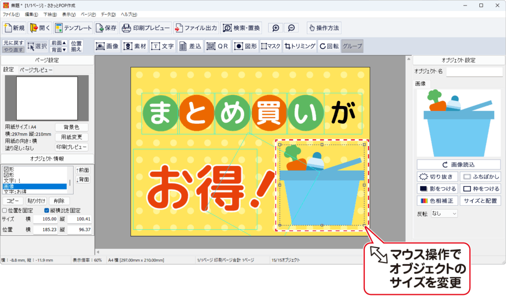 マウス操作でオブジェクトのサイズを変更します。例:図形を拡大