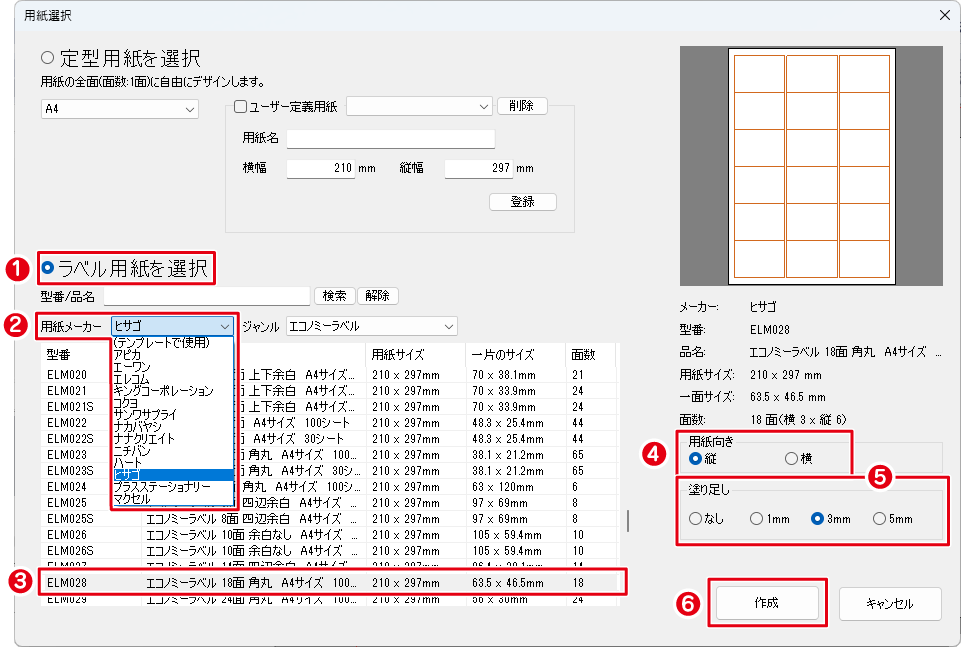 用紙型番  ※例:ELM028 エコノミーラベル 18面 角丸 A4サイズ(18面 横63.5×縦46.5)