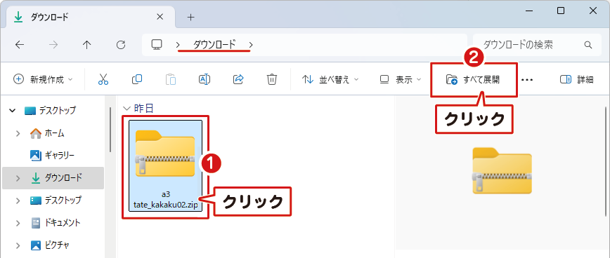 ※ フォルダを右クリックして、「すべて展開」からも解凍できます。